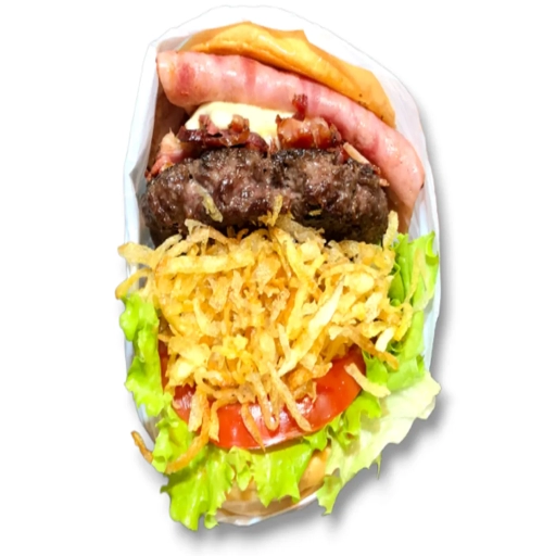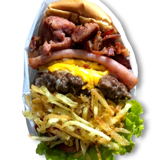 Um lanche clássico com Suculento Bife Artesanal de 120gr, Linguiça de churrasco, Bacon premium, Queijo Cheddar Fatiado... Ver completo