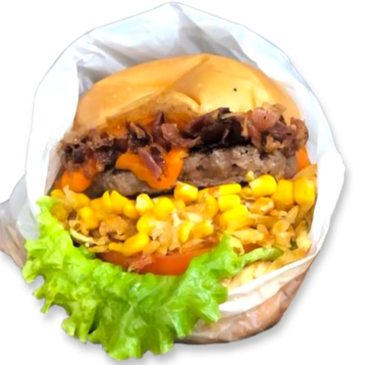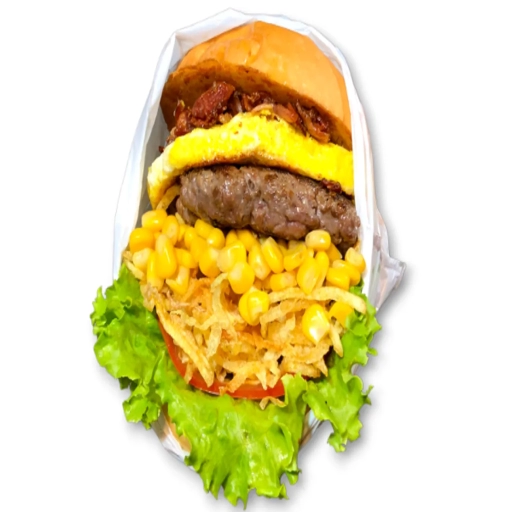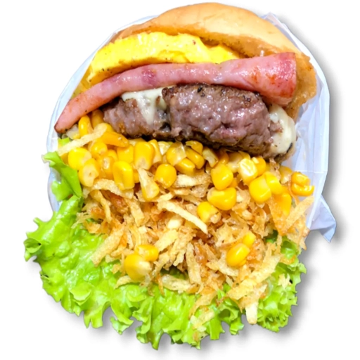 Suculento Bife Artesanal de 120gr, Bacon Premium, Ovo chapeado, Batata palha Caseira , Milho, Maionese Caseira, Ketchup,... Ver completo